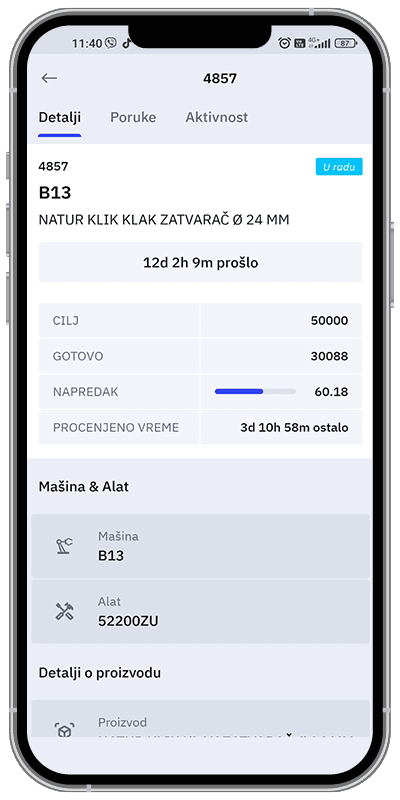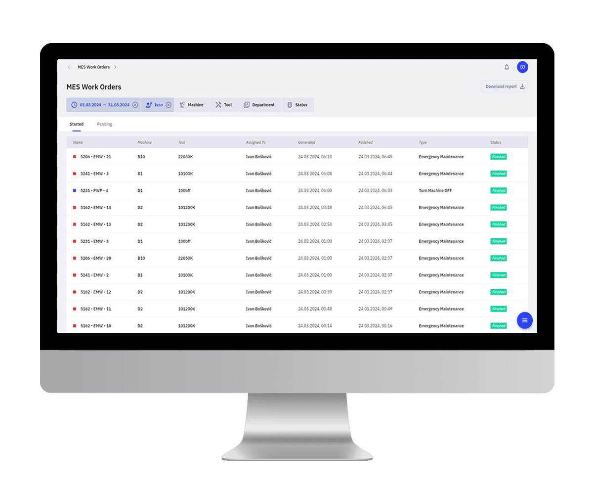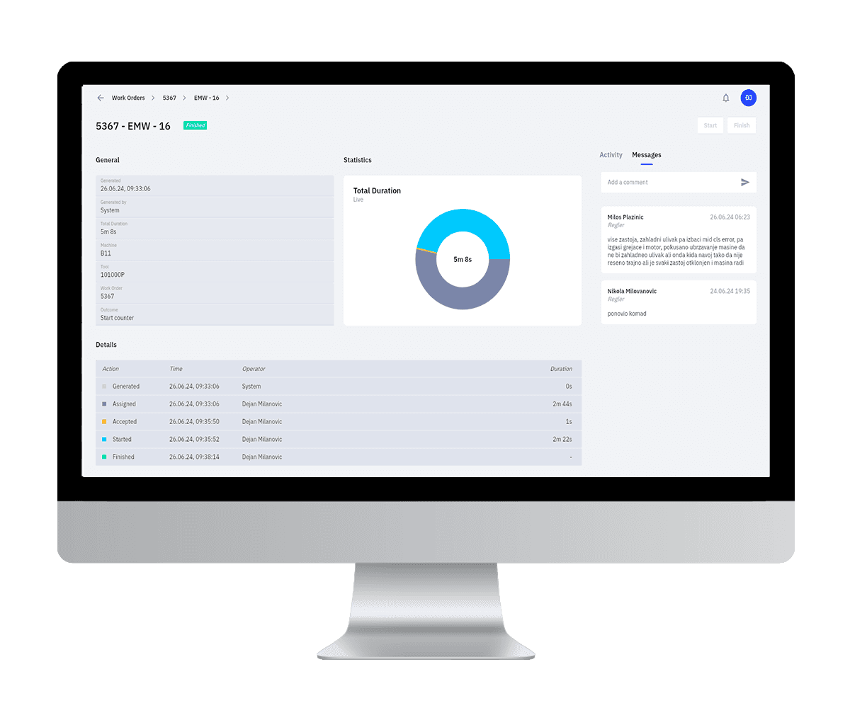 Kompletan uvid u proizvodne rezultate, efikasnost rada i utrošeno vreme za rešavanje problema — dostupno odmah i za bilo koji vremenski period.